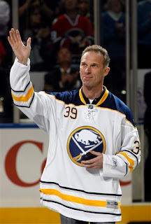 ハシェックはセイバーズ時代に寄付をして設立した、バッファローの貧しい子供たちがホッケーができるようにする団体、Hasek's Heroesが主催するイベントのために当地を訪れたそうです。ハシェックがセイバーズのジャージを着てHSBCアリーナに立つのは10年ぶりということになるのでしょう。ジャージは現在のデザインで、ハシェックがいた時代とは違いますが。